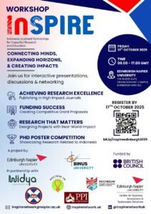 We are delighted to announce the speakers, panellists, and programme for the upcoming InSPIRE Workshop, taking place on Friday, 31st October 2025, from 09:00 to 17:00 at Edinburgh Napier The Business School, Craiglockhart Campus, Edinburgh, in collaboration with BINUS University Indonesia.